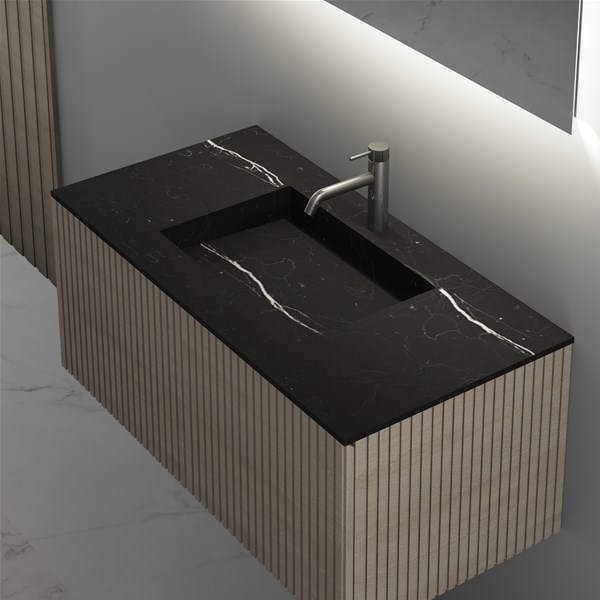 Composizione sospesa 100x50 composta da base c/ cassetto ELEMENT.C-100 in finitura Rovere Sbiancato Element 10 e top c/ vasca integrata in Silestone® Nero Marquinia c/ vasca 49x30 e foro miscelatore sul piano. Apertura push-pull come da collezione, sponde in metallo e fondo antigraffio c/ chiusura softclose Tip-on Legrabox Blum Blumotion.